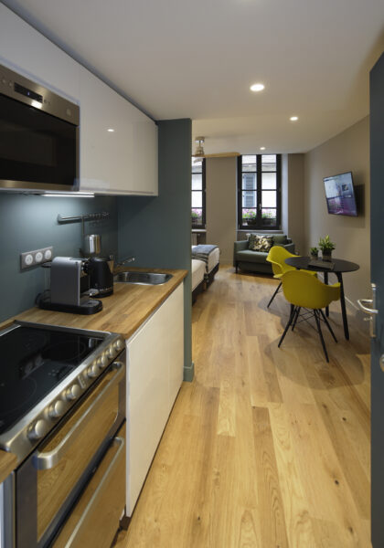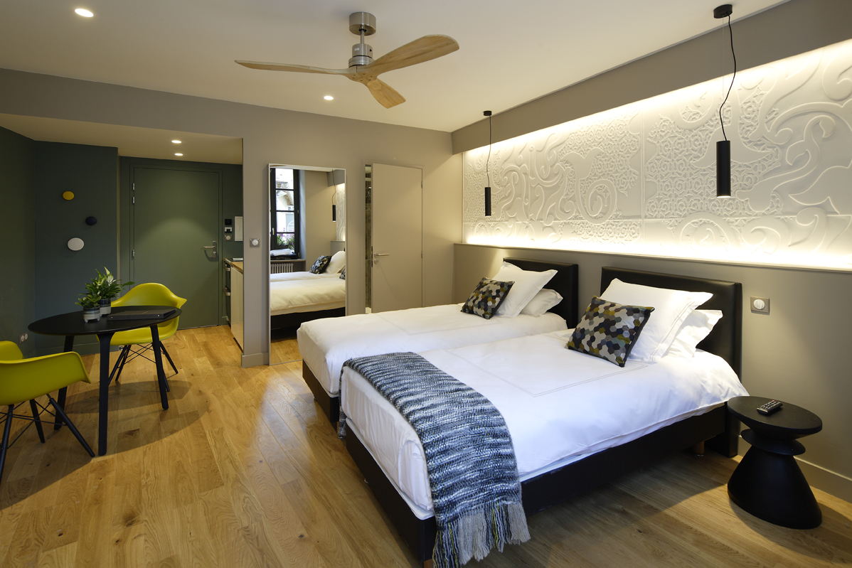 Suite 11 located on the first floor of an 18th century building. Comfortable stairs to go up. It is decorated in contemporary style and furnished with designer furniture. Oak parquet floor.