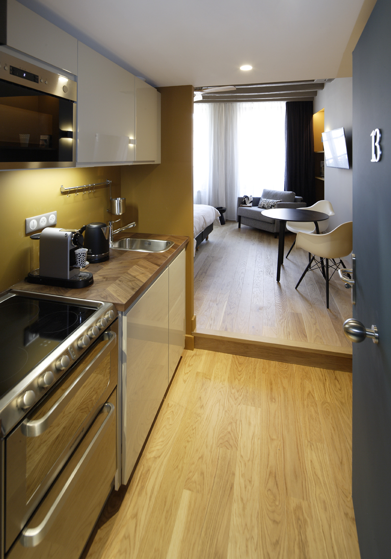 Suite # 13 located on the second floor of an 18th century building. Comfortable stairs to go up. It is decorated in contemporary style and furnished with designer furniture. Oak parquet floor.