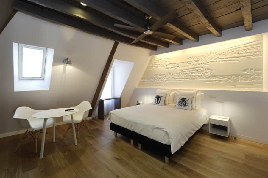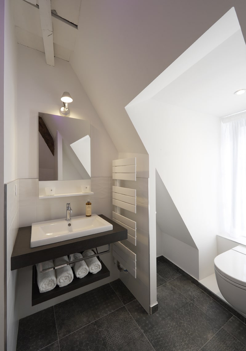 Suite No 4 is beside the Creuse and on the second floor of the building. It has dormer windows, is decorated in a contemporary style and is furnished with designer furniture. The floorboards are oak.