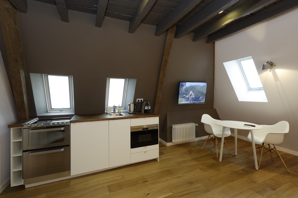 Kitchenette (fully-equipped with dishwasher, oven, refrigerator, crockery, etc), Nespresso coffee machine, wardrobe with storage and hanging space, desk, dining table with two chairs, king-size double bed (160cm), Smart TV with 40-in screen which will also receive radio. Free Internet access.