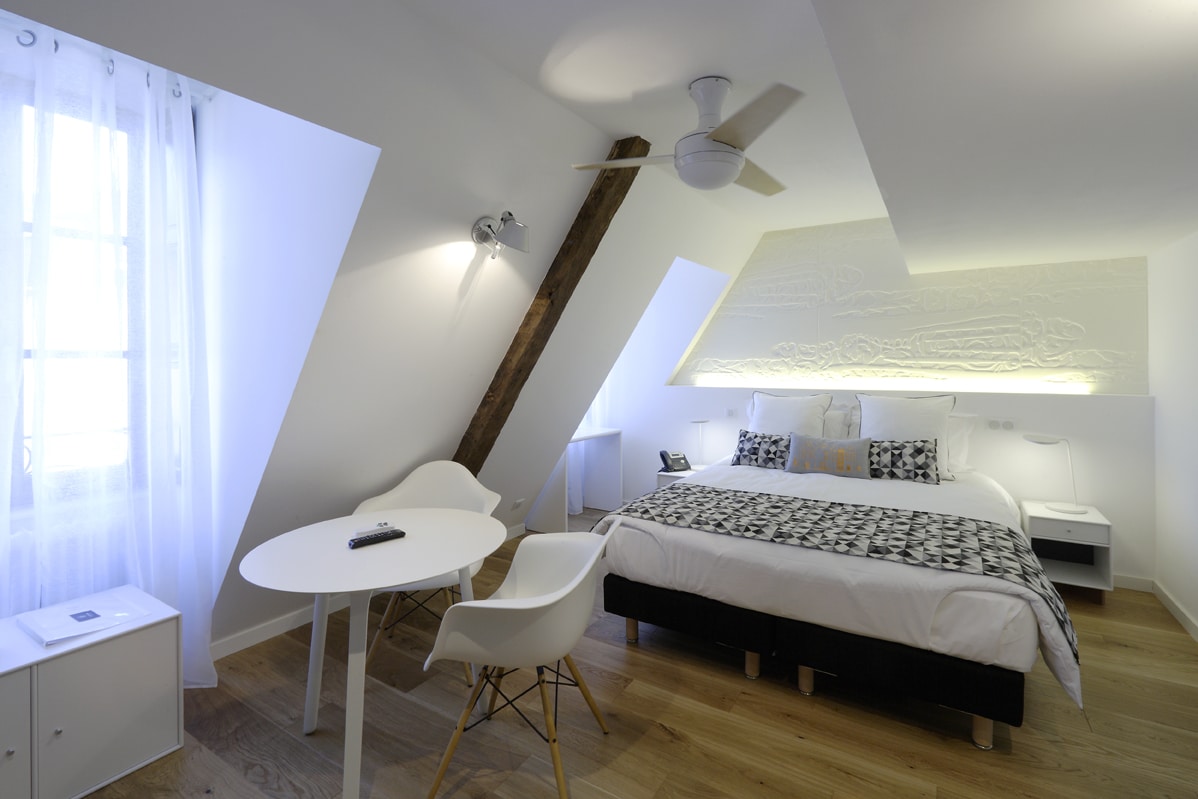 Suite No 5 is beside the Creuse and on the second floor of the building. It has dormer windows, is decorated in a contemporary style and is furnished with designer furniture. The floorboards are oak.
