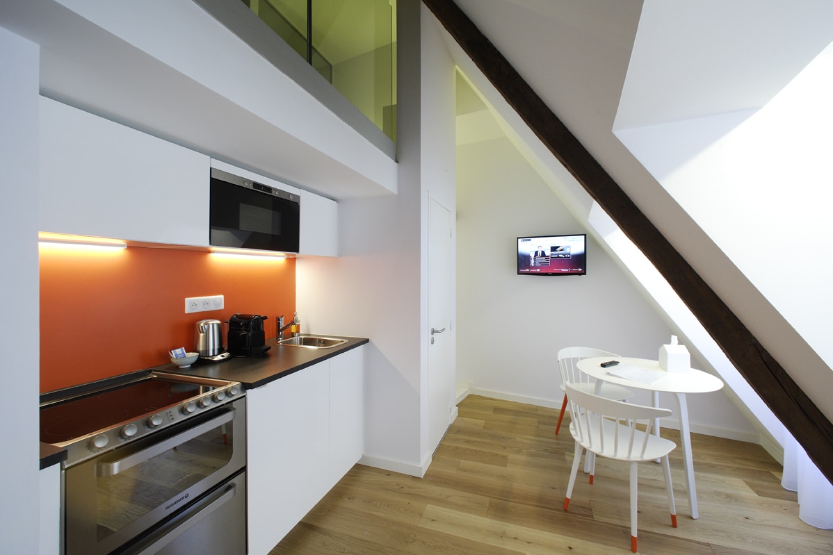 Kitchenette (fully-equipped with dishwasher, oven, refrigerator, crockery, etc), Nespresso coffee machine, wardrobe with storage and hanging space, desk, dining table with two chairs, king-size double bed (160cm), two Smart TVs with 28-in and 32-in screens which will also receive radio. Free Internet access.