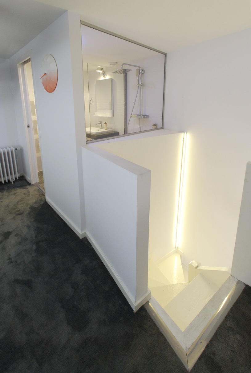 Suite No 6 is beside the Creuse and on the second floor of the building. It has dormer windows, is decorated in a contemporary style and is furnished with designer furniture. The floorboards are oak and there is thick carpeting in the bedroom.