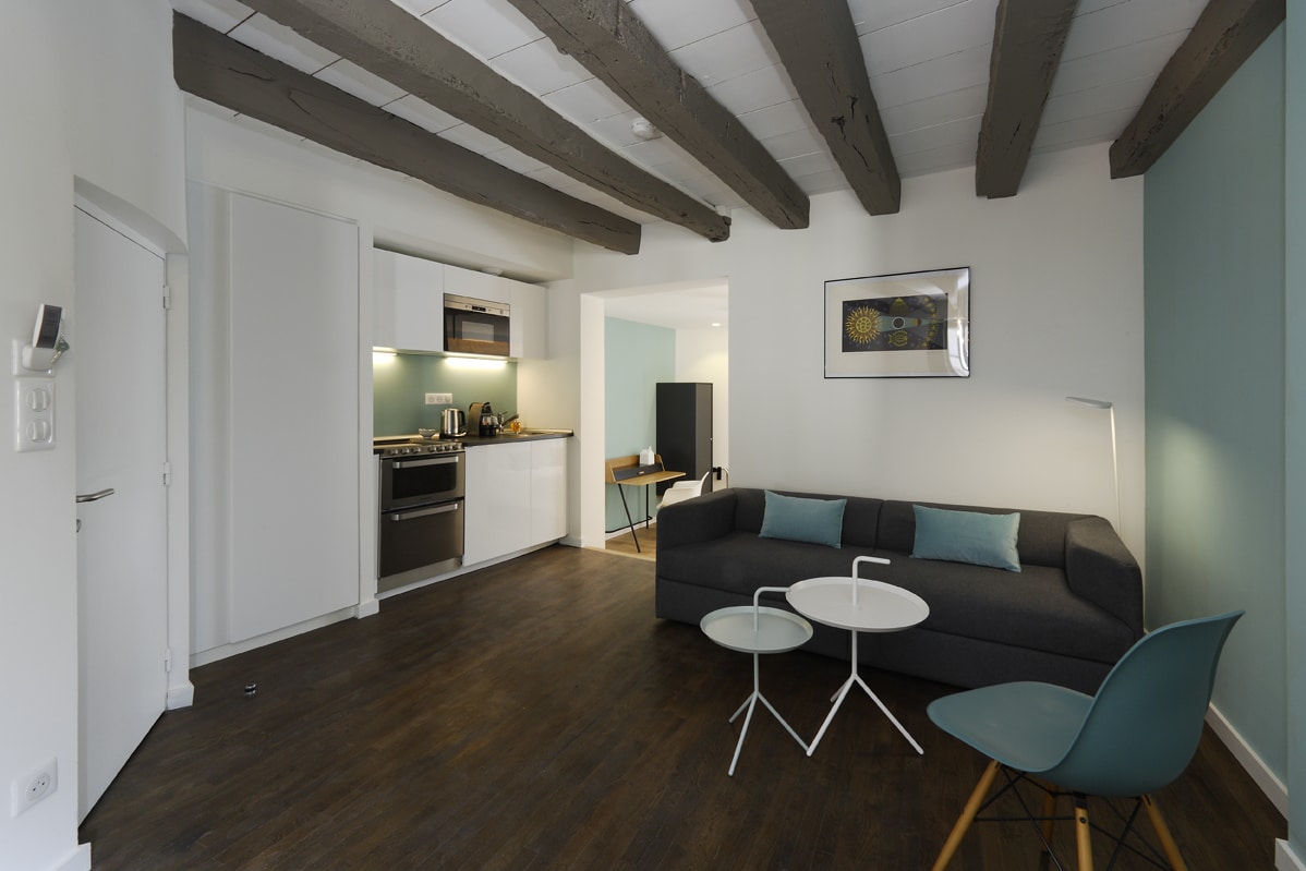 Kitchenette (fully-equipped with dishwasher, oven, refrigerator, crockery, etc), Nespresso coffee machine, wardrobe with storage and hanging space, desk, dining table with four chairs, king-size double bed (160cm), comfortable sofa-bed, two Smart TVs with 40-in and 28-in screens which will also receive radio. Free Internet access.