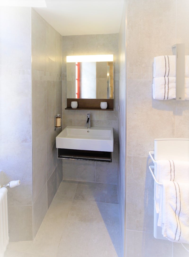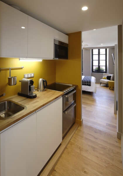 Chambre studio n°10 située au premier étage d’un bâtiment du 18ème siècle. Escalier confortable pour y monter. Elle est décorée dans le style contemporain et meublée de meubles de designers. Parquet de chêne au sol.