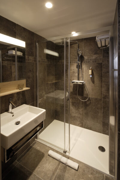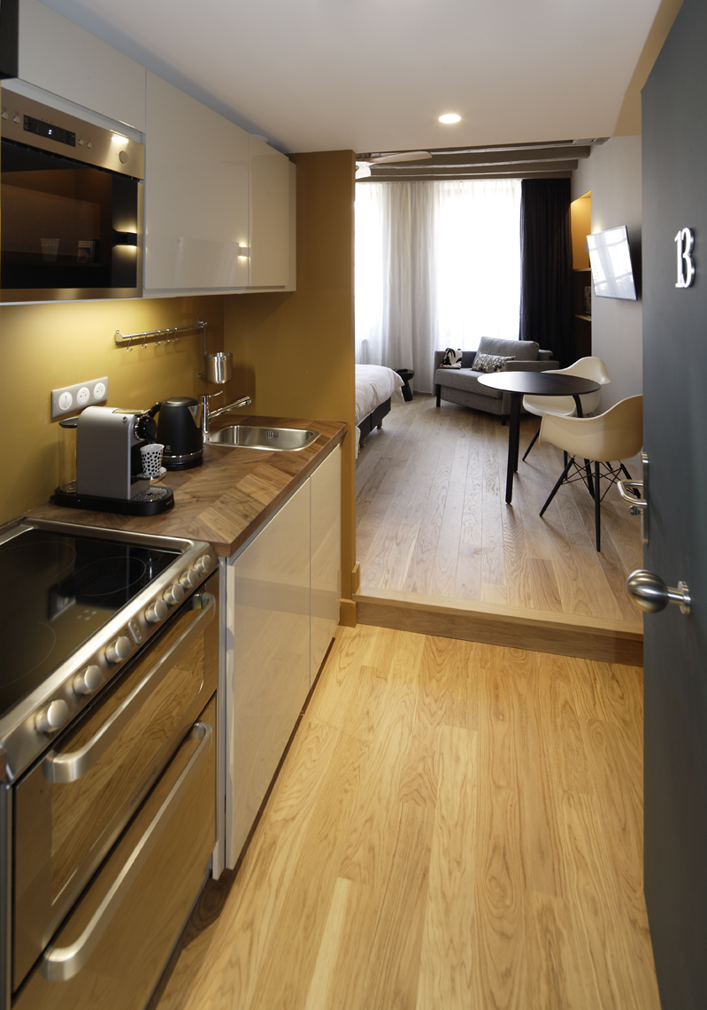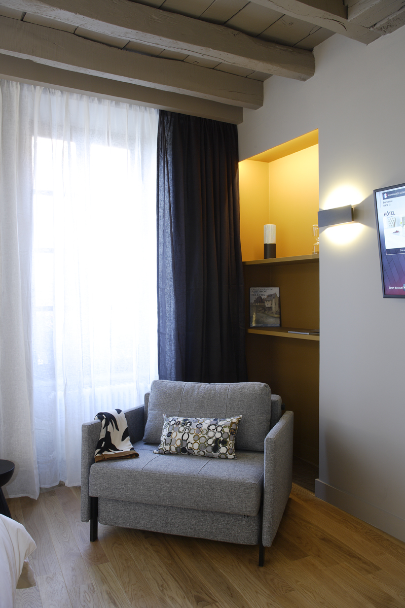 Chambre studio n°13 située au deuxième étage d’un bâtiment du 18ème siècle. Escalier confortable pour y monter. Elle est décorée dans le style contemporain et meublée de meubles de designers. Parquet de chêne au sol.